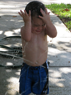 So Phil and I decided to replicate a fun summer toy we saw on a blog I visit a lot. It basically called for a few PVC pipes and assorted elbows and t-joints, some PVC cement, and well placed holes and voila! An awesome homemade "car wash" sprinkler! Since it was 104 today, we decided it would be a great time to test it out! I texted my neighbors and the fun ensued! Check out these super cute pictures! (First 4 were taken by my neighbor, Kiki)